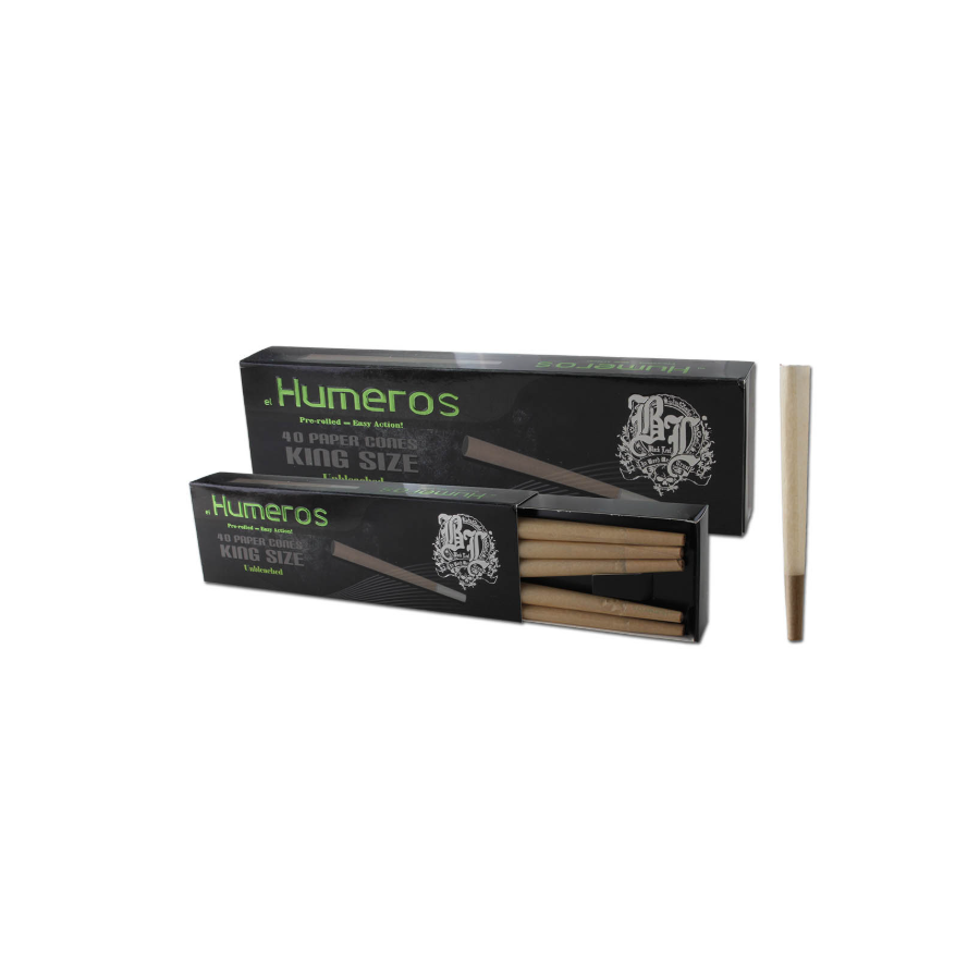 Le Black Leaf El Humeross Conical Paper est un cône pré-roulé King Size 📜 prêt à l'emploi, idéal pour les sessions généreuses et pratiques 💨. Son papier fin garantit une combustion lente, régulière et sans altération du goût. Format conique pour plus de capacité, signé Black Leaf, référence en accessoires fumeurs 🔥.