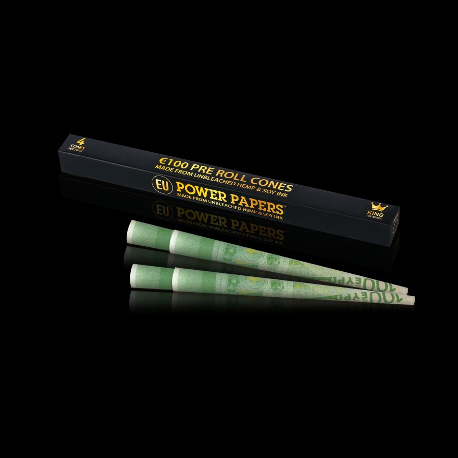 Les POWER PAPERS™ EUR€100 Pre Rolled Cones sont des cônes pré-roulés au design billet de 100 euros. Pratiques, originaux et faciles à remplir, ils offrent une combustion régulière et une expérience simple sans roulage