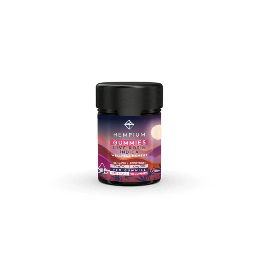 Les Bonbons THC Indica Rosin 25mg Full Spectrum Hempium associent 7 mg de THC et 10 mg de CBD pour une relaxation profonde. Extraction Live Rosin et saveur fruits rouges