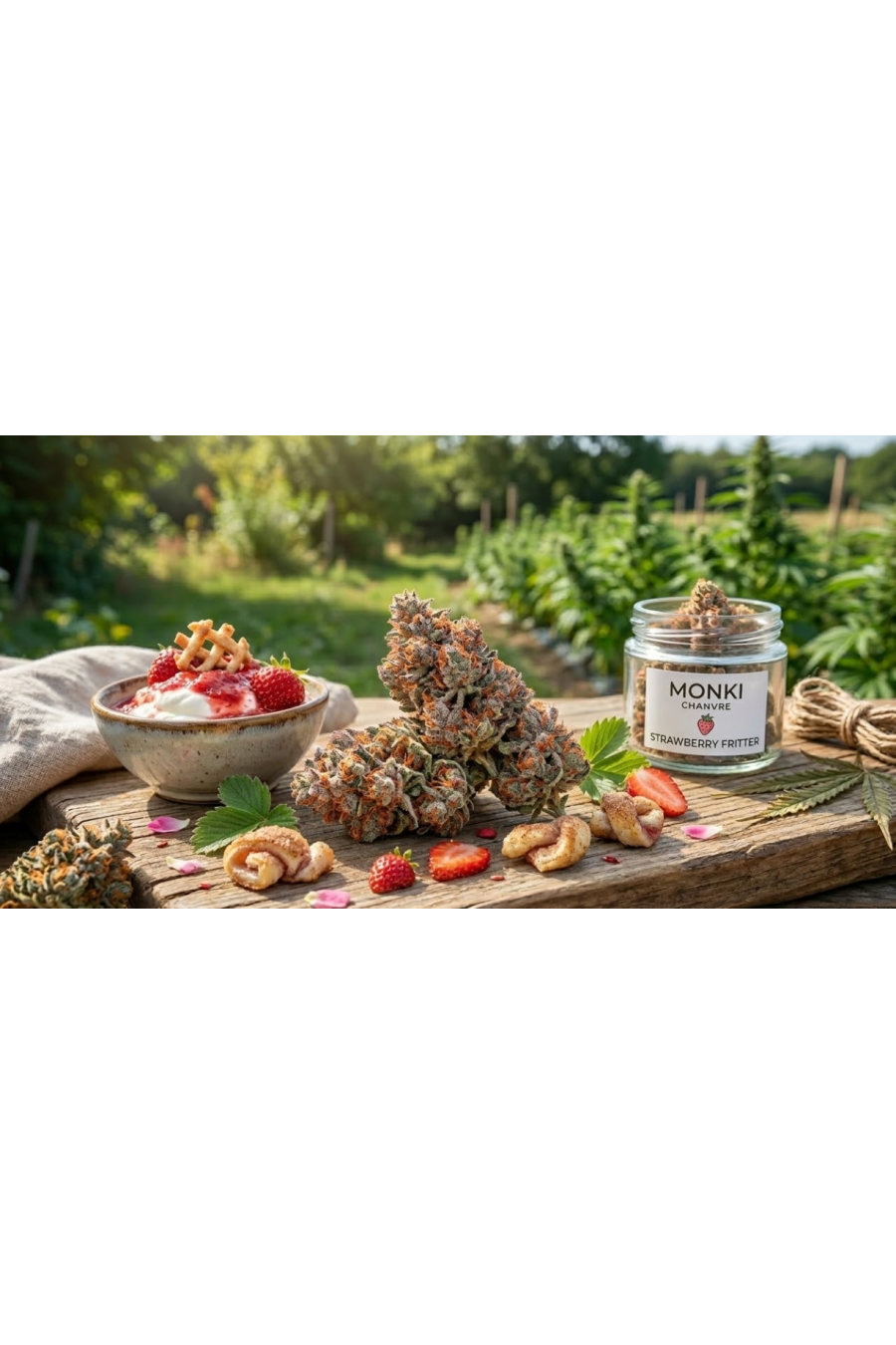 La Strawberry Fritter se distingue par un parfum captivant de fraise des bois bien mûre, nuancé par des notes sucrées et crémeuses évoquant un beignet chaud. Visuellement, les fleurs sont denses, parées de teintes vert tendre et de pistils rosés, le tout enveloppé dans une belle couche de résine. Grâce à une récolte manuelle et un affinage méticuleux, elle offre une expérience équilibrée, idéale pour une parenthèse de détente savoureuse à tout moment de la journée.