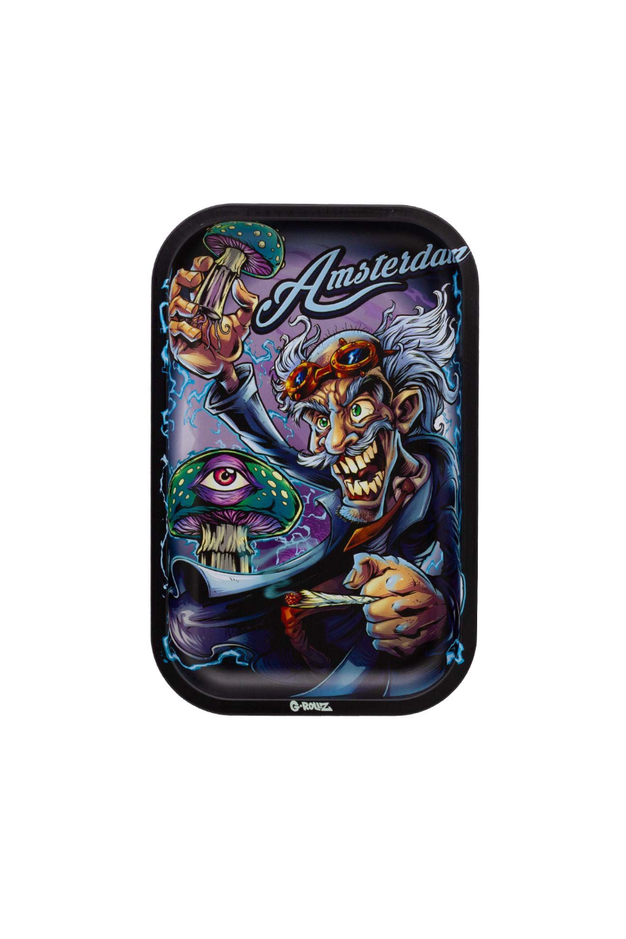 Le plateau G-Rollz "Amsterdam Mad Scientist" allie design artistique et fonctionnalité supérieure. Fabriqué en métal de haute qualité, il présente une surface lisse et des bords surélevés arrondis pour éviter toute perte de matière et faciliter le roulage. Son format Medium est idéal pour organiser vos accessoires tout en restant facilement transportable. Avec son visuel exclusif et sa résistance aux rayures, c'est un accessoire durable qui apporte une touche d'originalité à votre espace de préparation. Chaque plateau est muni d'un code d'authenticité vérifiable.